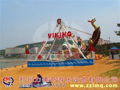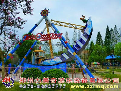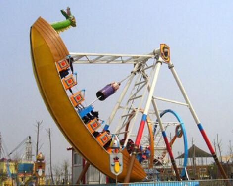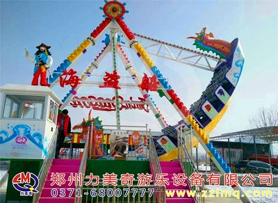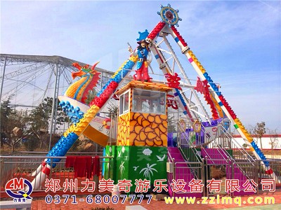 兒童游樂(lè)設(shè)備海盜船是一種全新設(shè)計(jì)的觀覽車類游藝機(jī),是一種繞水平軸往復(fù)擺動(dòng)的游樂(lè)項(xiàng)目,該種游藝機(jī)因造型圖同而名稱各異,“海盜船”因?yàn)槠渫庑畏鹿糯1I船而得名。海盜船造型為美洲印第安部落風(fēng)格,總高度7.2米,大擺角45度。