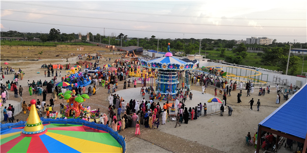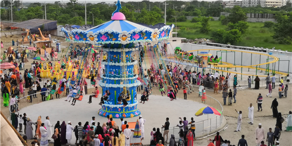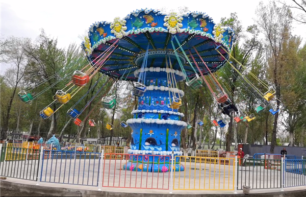 颶風(fēng)飛椅轉(zhuǎn)動時,乘坐在吊椅上的乘客猶如在藍(lán)天飛舞,體驗刺激收獲快樂。颶風(fēng)飛椅是集旋轉(zhuǎn)、升降、變傾角等多種運動形式于一體的大型飛行塔類游藝機(jī)。當(dāng)傘形轉(zhuǎn)盤和中間轉(zhuǎn)臺反向旋轉(zhuǎn)啟動時,塔身徐徐上升,此時轉(zhuǎn)盤搖擺,飛椅呈波浪蕩漾狀,游客猶如在空中飛翔、飄蕩,海闊天空、驚心動魄。設(shè)備巍峨雄偉,它柔和了絢麗的燈飾和七彩繽紛的圖案設(shè)計,造型華麗,是目前游樂場上漂亮、吸引人的游藝機(jī)之一,也是標(biāo)準(zhǔn)的主題公園或現(xiàn)代游樂場的選擇項目之一。
